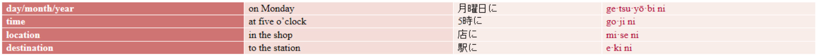 English prepositions are often rendered by particles such as ni (に), e (へ) and de (で) in Japanese.