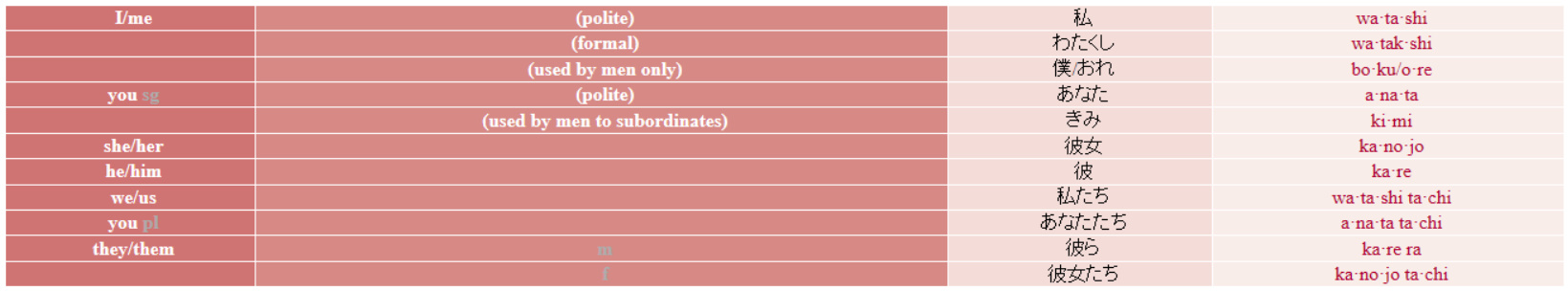 Note that there are no different pronouns for subjects (eg I, she), objects (eg me, her) and possessives (eg my, her). The difference between these is indicated by the particle that follows the pronouns in the sentence: wa (は) for the topic, ga (が) for the subject, o (を) for the object and no (の) for the possessive (for more details see particles):