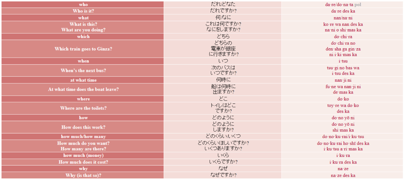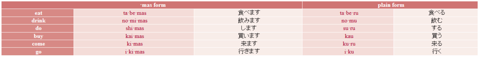 In Japanese dictionaries, verbs will usually be listed in their 'plain form'. This form is not appropriate for most conversations though. In this phrasebook, we have chosen the polite ·mas (ます) form for most phrases, and for ease of use we have also listed the verbs in the dictionary in the ·mas (ます) form.